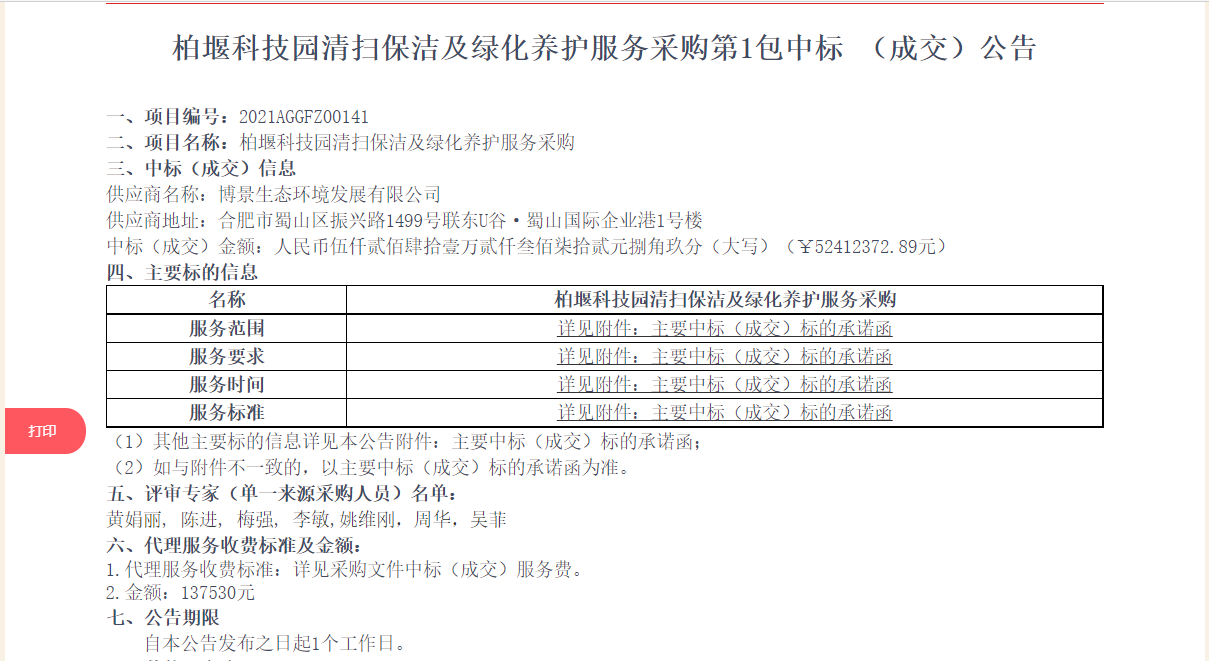 安徽合肥公共資源交易中心消息,8月11日新一輪柏堰科技園清掃保潔及綠化養(yǎng)護服務(wù)采購項目開標,成交價101798332.9元,比上輪次增加30527305.9元(該項目上輪次政府采購于2018年1月份開標,成交價71271027元)。項目采購需求表明,柏堰科技園清掃保潔及綠化養(yǎng)護服務(wù)采購項目服務(wù)內(nèi)容包括清掃保潔、綠化養(yǎng)護、柏堰湖水面管護、攤?cè)狐c管理等四方面,服務(wù)期限3年。中標結(jié)果如下: