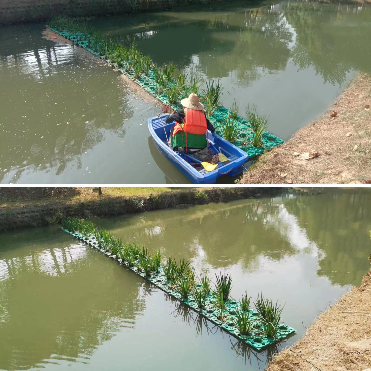生態(tài)浮島技術(shù)是按照自然界的自身規(guī)律,將挺水植物利用載體栽培在自然水域的水面,不需要泥土的營(yíng)養(yǎng),利用植物根系在水中吸收、吸附富營(yíng)養(yǎng)鹽物質(zhì)以及通過(guò)微生物對(duì)富營(yíng)養(yǎng)鹽物質(zhì)的降解等作用,去除水體中的TN、TP等污染物質(zhì),達(dá)到水質(zhì)凈化、營(yíng)造景觀效果甚至收獲產(chǎn)量的目的,同時(shí)阻斷水域上流水面漂浮物,繼而進(jìn)行集中清理打撈。