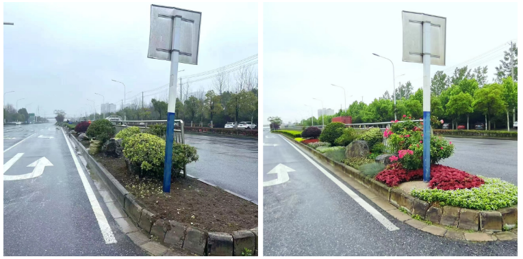 魏武路的提升改造,從制定計(jì)劃到最終落實(shí)歷時(shí)三個(gè)月,其中補(bǔ)植色塊約1.2萬(wàn)平、喬灌木250余株、草花4.5千平,粉龍?jiān)录炯s440株。為了增加道路綠化的整體景觀(guān)效果,本次提升改造注重植被運(yùn)用的創(chuàng)新和景觀(guān)視覺(jué)的層次感,植物上選擇一些在本市園林景觀(guān)中不常用的藍(lán)羊茅、龜甲冬青、紅花錦帶、粉龍?jiān)录?、五星?/strong>等花境植物,在色塊下層進(jìn)行地形改造,打造一種凹凸有致,線(xiàn)條流暢的水平景觀(guān)綠線(xiàn)。