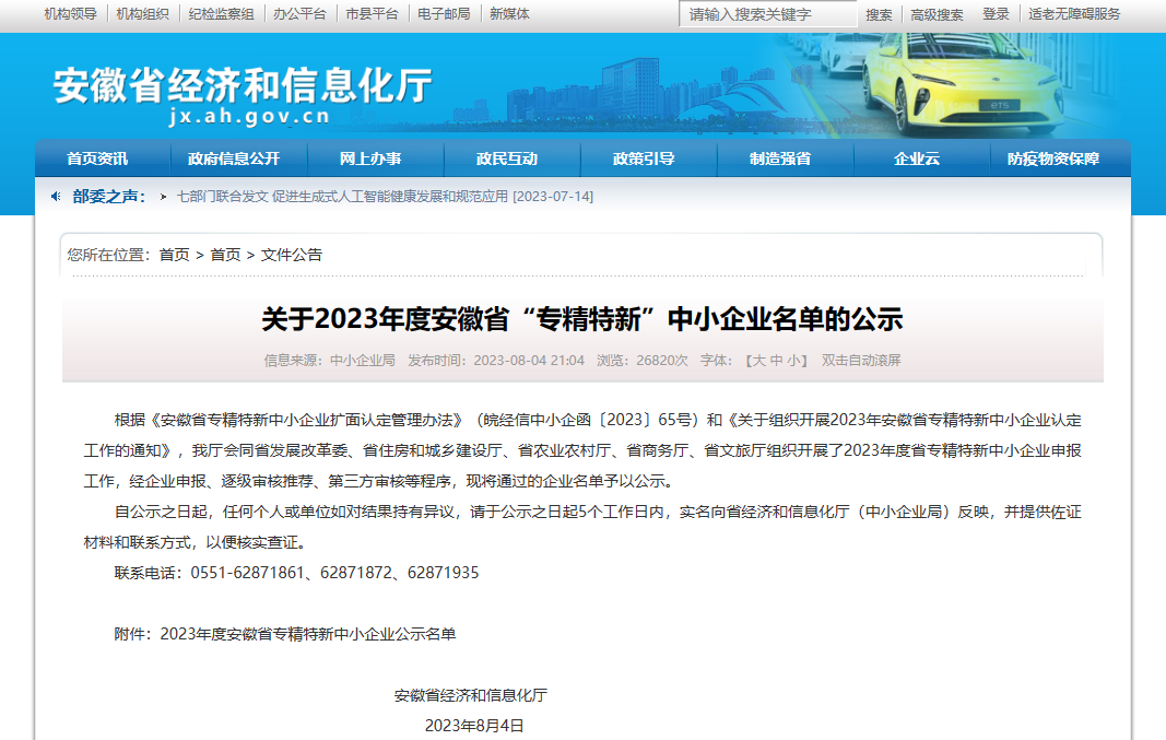 8月4日,安徽省經(jīng)濟和信息化廳公示了2023年度安徽省“專精特新”中小企業(yè)名單,博景生態(tài)環(huán)境股份有限公司脫穎而出,榮獲2023年度“安徽省專精特新中小企業(yè)”稱號。